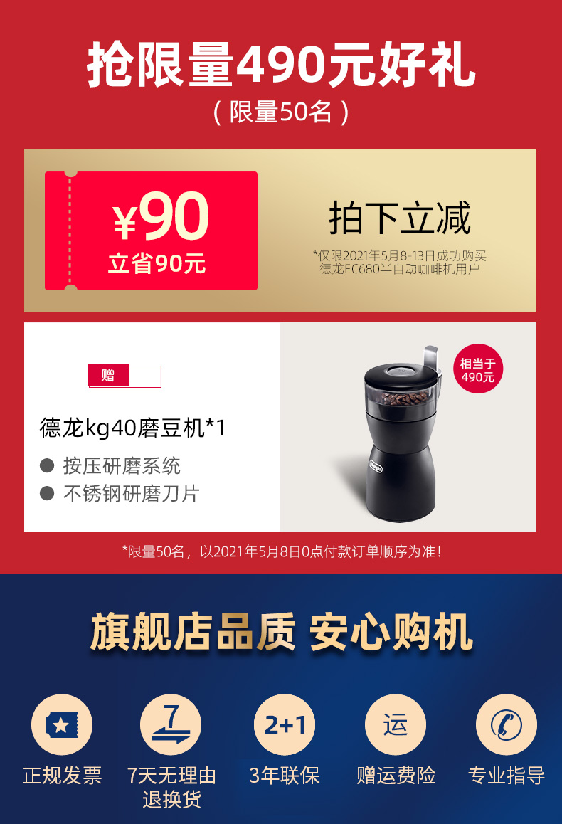 Delonghi/德龙家用半自动意式咖啡机EC680泵压式不锈钢小型办公室